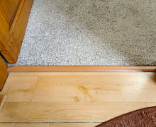 Способ монтажа: алюминиевый порожек крепится в проем между двумя напольными покрытиями с помощью универсального би-дюбеля. В полу просверливаются отверстия, а затем би-дюбели заводятся своей шляпкой в нишу с обратной стороны порога и вставляются в просверленные отверстия.