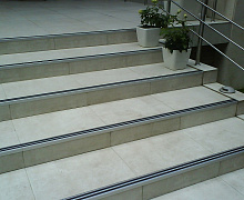 Способ монтажа: алюминиевый порожек без вставки крепится на ступени при помощи саморезов (идут в комплекте). Затем прорезиненную ПВХ вставку нужно нагреть строительным или обычным феном, либо подержать в горячей воде, чтобы материал стал мягче и легче вошел в паз профиля.